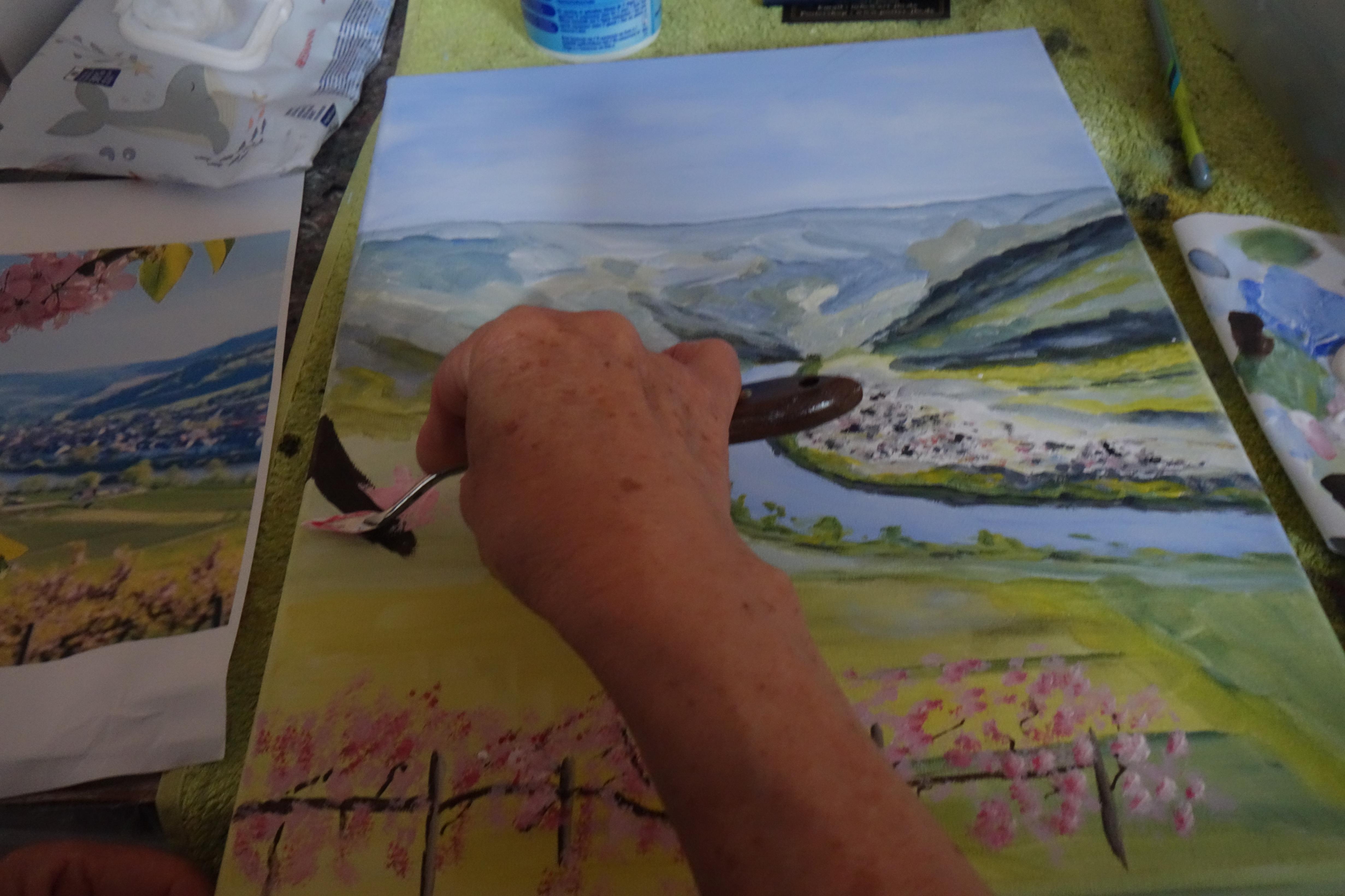 In der inspirierenden Atmosphäre der Vinothek im Winninger Spital setzten sich die Teilnehmenden intensiv mit der erwachenden Mosellandschaft auseinander: blühende Weinberge, Lichtreflexe auf dem Wasser und die besondere Farbigkeit des Frühlings wurden auf ganz individuelle Weise auf die Leinwand gebracht.